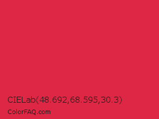CIELab 48.692,68.595,30.3 Color is a normal red color and the nearest color is Rusty Red #da2c43. Hex code #de2645 and RGB value is rgb(222,38,69). In RGB color space, this color is composed of 87% red, 15% green, 27% blue, In CMYK color space, this color is composed of 0% cyan, 83% magenta, 69% yellow , 13% black , In HSL color space, this color has a hue angle of 350° , 74% saturation and 51% lightness.