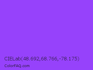 CIELab 48.692,68.766,-78.175 Color is a light violet color and the nearest color is Navy Purple #9457eb. Hex code #9642fb and RGB value is rgb(150,66,251). In RGB color space, this color is composed of 59% red, 26% green, 98% blue, In CMYK color space, this color is composed of 40% cyan, 74% magenta, 0% yellow , 2% black , In HSL color space, this color has a hue angle of 267° , 96% saturation and 62% lightness.