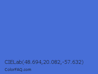 CIELab 48.694,20.082,-57.632 Color is a normal blue color and the nearest color is Han Blue #446ccf. Hex code #476ed6 and RGB value is rgb(71,110,214). In RGB color space, this color is composed of 28% red, 43% green, 84% blue, In CMYK color space, this color is composed of 67% cyan, 49% magenta, 0% yellow , 16% black , In HSL color space, this color has a hue angle of 224° , 64% saturation and 56% lightness.