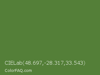CIELab 48.697,-28.317,33.543 Color is a normal green color and the nearest color is Fern Green #4f7942. Hex code #547f38 and RGB value is rgb(84,127,56). In RGB color space, this color is composed of 33% red, 50% green, 22% blue, In CMYK color space, this color is composed of 34% cyan, 0% magenta, 56% yellow , 50% black , In HSL color space, this color has a hue angle of 96° , 39% saturation and 36% lightness.