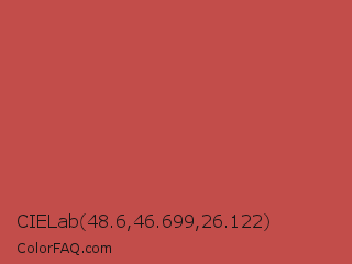 CIELab 48.6,46.699,26.122 Color is a normal red color and the nearest color is Bittersweet Shimmer #bf4f51. Hex code #c24d4a and RGB value is rgb(194,77,74). In RGB color space, this color is composed of 76% red, 30% green, 29% blue, In CMYK color space, this color is composed of 0% cyan, 60% magenta, 62% yellow , 24% black , In HSL color space, this color has a hue angle of 2° , 50% saturation and 53% lightness.