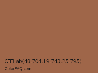 CIELab 48.704,19.743,25.795 Color is a normal orange color and the nearest color is Cape Palliser #a26645. Hex code #9f6649 and RGB value is rgb(159,102,73). In RGB color space, this color is composed of 62% red, 40% green, 29% blue, In CMYK color space, this color is composed of 0% cyan, 36% magenta, 54% yellow , 38% black , In HSL color space, this color has a hue angle of 20° , 37% saturation and 45% lightness.