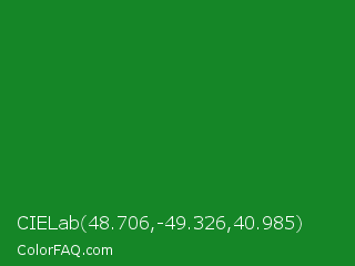CIELab 48.706,-49.326,40.985 Color is a dark green color and the nearest color is Forest Green #228b22. Hex code #158627 and RGB value is rgb(21,134,39). In RGB color space, this color is composed of 8% red, 53% green, 15% blue, In CMYK color space, this color is composed of 84% cyan, 0% magenta, 71% yellow , 47% black , In HSL color space, this color has a hue angle of 130° , 73% saturation and 30% lightness.