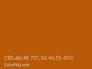 CIELab 48.707,34.44,55.453 Color is a normal orange color and the nearest color is Pumpkin Skin #b1610b. Hex code #b8590a and RGB value is rgb(184,89,10). In RGB color space, this color is composed of 72% red, 35% green, 4% blue, In CMYK color space, this color is composed of 0% cyan, 52% magenta, 95% yellow , 28% black , In HSL color space, this color has a hue angle of 27° , 90% saturation and 38% lightness.