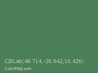 CIELab 48.714,-26.642,16.426 Color is a normal green color and the nearest color is Middle Green #4d8c57. Hex code #4b7f57 and RGB value is rgb(75,127,87). In RGB color space, this color is composed of 29% red, 50% green, 34% blue, In CMYK color space, this color is composed of 41% cyan, 0% magenta, 31% yellow , 50% black , In HSL color space, this color has a hue angle of 134° , 26% saturation and 40% lightness.