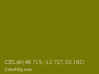 CIELab 48.715,-12.727,53.182 Color is a dark yellow color and the nearest color is Bronze Yellow #737000. Hex code #777804 and RGB value is rgb(119,120,4). In RGB color space, this color is composed of 47% red, 47% green, 2% blue, In CMYK color space, this color is composed of 1% cyan, 0% magenta, 97% yellow , 53% black , In HSL color space, this color has a hue angle of 61° , 94% saturation and 24% lightness.