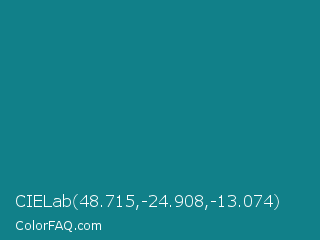 CIELab 48.715,-24.908,-13.074 Color is a dark cyan color and the nearest color is Metallic Seaweed #0a7e8c. Hex code #118089 and RGB value is rgb(17,128,137). In RGB color space, this color is composed of 7% red, 50% green, 54% blue, In CMYK color space, this color is composed of 88% cyan, 7% magenta, 0% yellow , 46% black , In HSL color space, this color has a hue angle of 185° , 78% saturation and 30% lightness.