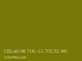 CIELab 48.718,-12.705,52.98 Color is a dark yellow color and the nearest color is Bronze Yellow #737000. Hex code #777805 and RGB value is rgb(119,120,5). In RGB color space, this color is composed of 47% red, 47% green, 2% blue, In CMYK color space, this color is composed of 1% cyan, 0% magenta, 96% yellow , 53% black , In HSL color space, this color has a hue angle of 61° , 92% saturation and 25% lightness.