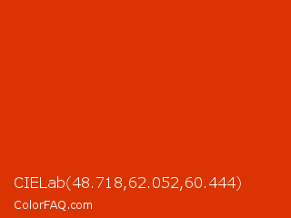 CIELab 48.718,62.052,60.444 Color is a normal red color and the nearest color is Grenadier #d54600. Hex code #da3402 and RGB value is rgb(218,52,2). In RGB color space, this color is composed of 85% red, 20% green, 1% blue, In CMYK color space, this color is composed of 0% cyan, 76% magenta, 99% yellow , 15% black , In HSL color space, this color has a hue angle of 14° , 98% saturation and 43% lightness.