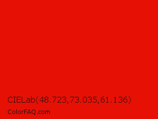 CIELab 48.723,73.035,61.136 Color is a normal red color and the nearest color is KU Crimson #e8000d. Hex code #e71005 and RGB value is rgb(231,16,5). In RGB color space, this color is composed of 91% red, 6% green, 2% blue, In CMYK color space, this color is composed of 0% cyan, 93% magenta, 98% yellow , 9% black , In HSL color space, this color has a hue angle of 3° , 96% saturation and 46% lightness.