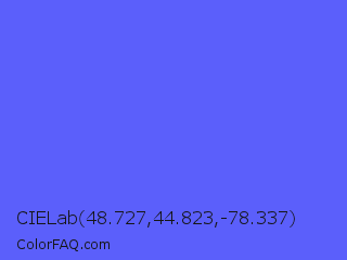 CIELab 48.727,44.823,-78.337 Color is a light blue color and the nearest color is Very Light Blue #6666ff. Hex code #5b5ffb and RGB value is rgb(91,95,251). In RGB color space, this color is composed of 36% red, 37% green, 98% blue, In CMYK color space, this color is composed of 64% cyan, 62% magenta, 0% yellow , 2% black , In HSL color space, this color has a hue angle of 239° , 95% saturation and 67% lightness.