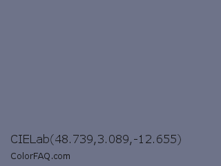CIELab 48.739,3.089,-12.655 Color is a normal blue color and the nearest color is Storm Gray #717486. Hex code #6e7389 and RGB value is rgb(110,115,137). In RGB color space, this color is composed of 43% red, 45% green, 54% blue, In CMYK color space, this color is composed of 20% cyan, 16% magenta, 0% yellow , 46% black , In HSL color space, this color has a hue angle of 229° , 11% saturation and 48% lightness.