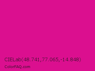 CIELab 48.741,77.065,-14.848 Color is a normal magenta color and the nearest color is Barbie Pink #e0218a. Hex code #db0f8f and RGB value is rgb(219,15,143). In RGB color space, this color is composed of 86% red, 6% green, 56% blue, In CMYK color space, this color is composed of 0% cyan, 93% magenta, 35% yellow , 14% black , In HSL color space, this color has a hue angle of 322° , 87% saturation and 46% lightness.