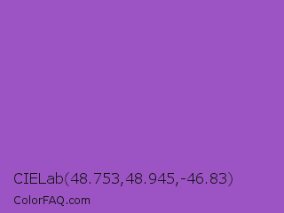 CIELab 48.753,48.945,-46.83 Color is a normal purple color and the nearest color is Deep Lilac #9955bb. Hex code #9c54c4 and RGB value is rgb(156,84,196). In RGB color space, this color is composed of 61% red, 33% green, 77% blue, In CMYK color space, this color is composed of 20% cyan, 57% magenta, 0% yellow , 23% black , In HSL color space, this color has a hue angle of 279° , 49% saturation and 55% lightness.