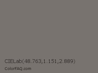 CIELab 48.763,1.151,2.889 Color is a normal orange color and the nearest color is Nickel #727472. Hex code #78736f and RGB value is rgb(120,115,111). In RGB color space, this color is composed of 47% red, 45% green, 44% blue, In CMYK color space, this color is composed of 0% cyan, 4% magenta, 8% yellow , 53% black , In HSL color space, this color has a hue angle of 27° , 4% saturation and 45% lightness.