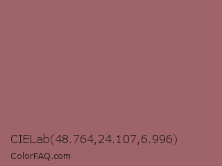 CIELab 48.764,24.107,6.996 Color is a normal red color and the nearest color is Copper Rose #996666. Hex code #9e6469 and RGB value is rgb(158,100,105). In RGB color space, this color is composed of 62% red, 39% green, 41% blue, In CMYK color space, this color is composed of 0% cyan, 37% magenta, 34% yellow , 38% black , In HSL color space, this color has a hue angle of 355° , 23% saturation and 51% lightness.