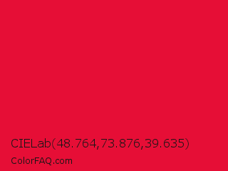 CIELab 48.764,73.876,39.635 Color is a normal red color and the nearest color is Red Ribbon #ed0a3f. Hex code #e60e36 and RGB value is rgb(230,14,54). In RGB color space, this color is composed of 90% red, 5% green, 21% blue, In CMYK color space, this color is composed of 0% cyan, 94% magenta, 77% yellow , 10% black , In HSL color space, this color has a hue angle of 349° , 89% saturation and 48% lightness.