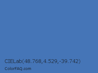 CIELab 48.768,4.529,-39.742 Color is a normal blue color and the nearest color is Steel Blue #4682b4. Hex code #4575b7 and RGB value is rgb(69,117,183). In RGB color space, this color is composed of 27% red, 46% green, 72% blue, In CMYK color space, this color is composed of 62% cyan, 36% magenta, 0% yellow , 28% black , In HSL color space, this color has a hue angle of 215° , 45% saturation and 49% lightness.
