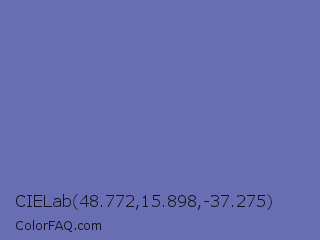 CIELab 48.772,15.898,-37.275 Color is a normal blue color and the nearest color is Toolbox #746cc0. Hex code #696eb3 and RGB value is rgb(105,110,179). In RGB color space, this color is composed of 41% red, 43% green, 70% blue, In CMYK color space, this color is composed of 41% cyan, 39% magenta, 0% yellow , 30% black , In HSL color space, this color has a hue angle of 236° , 33% saturation and 56% lightness.