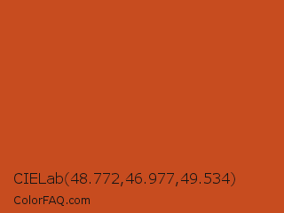 CIELab 48.772,46.977,49.534 Color is a normal orange color and the nearest color is Orange Roughy #c45719. Hex code #c74c1f and RGB value is rgb(199,76,31). In RGB color space, this color is composed of 78% red, 30% green, 12% blue, In CMYK color space, this color is composed of 0% cyan, 62% magenta, 84% yellow , 22% black , In HSL color space, this color has a hue angle of 16° , 73% saturation and 45% lightness.