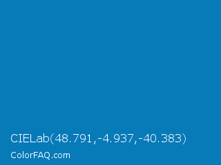 CIELab 48.791,-4.937,-40.383 Color is a normal blue color and the nearest color is Star Command Blue #007bb8. Hex code #077ab8 and RGB value is rgb(7,122,184). In RGB color space, this color is composed of 3% red, 48% green, 72% blue, In CMYK color space, this color is composed of 96% cyan, 34% magenta, 0% yellow , 28% black , In HSL color space, this color has a hue angle of 201° , 93% saturation and 37% lightness.