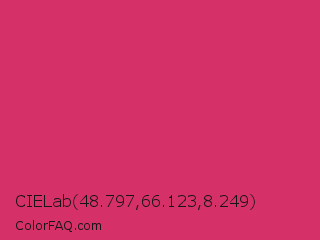 CIELab 48.797,66.123,8.249 Color is a normal rose color and the nearest color is Cerise Red #de3163. Hex code #d63069 and RGB value is rgb(214,48,105). In RGB color space, this color is composed of 84% red, 19% green, 41% blue, In CMYK color space, this color is composed of 0% cyan, 78% magenta, 51% yellow , 16% black , In HSL color space, this color has a hue angle of 339° , 67% saturation and 51% lightness.