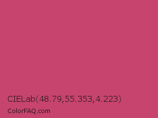 CIELab 48.79,55.353,4.223 Color is a normal rose color and the nearest color is Fuchsia Rose #c74375. Hex code #c7446f and RGB value is rgb(199,68,111). In RGB color space, this color is composed of 78% red, 27% green, 44% blue, In CMYK color space, this color is composed of 0% cyan, 66% magenta, 44% yellow , 22% black , In HSL color space, this color has a hue angle of 340° , 54% saturation and 52% lightness.