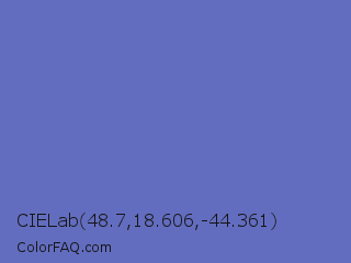 CIELab 48.7,18.606,-44.361 Color is a normal blue color and the nearest color is Toolbox #746cc0. Hex code #636dbf and RGB value is rgb(99,109,191). In RGB color space, this color is composed of 39% red, 43% green, 75% blue, In CMYK color space, this color is composed of 48% cyan, 43% magenta, 0% yellow , 25% black , In HSL color space, this color has a hue angle of 233° , 42% saturation and 57% lightness.