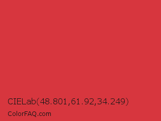 CIELab 48.801,61.92,34.249 Color is a normal red color and the nearest color is Jasper #d73b3e. Hex code #d7363e and RGB value is rgb(215,54,62). In RGB color space, this color is composed of 84% red, 21% green, 24% blue, In CMYK color space, this color is composed of 0% cyan, 75% magenta, 71% yellow , 16% black , In HSL color space, this color has a hue angle of 357° , 67% saturation and 53% lightness.