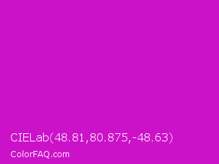CIELab 48.81,80.875,-48.63 Color is a normal magenta color and the nearest color is Deep Magenta #cc00cc. Hex code #cc12c8 and RGB value is rgb(204,18,200). In RGB color space, this color is composed of 80% red, 7% green, 78% blue, In CMYK color space, this color is composed of 0% cyan, 91% magenta, 2% yellow , 20% black , In HSL color space, this color has a hue angle of 301° , 84% saturation and 44% lightness.