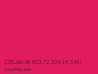 CIELab 48.823,72.324,16.546 Color is a normal rose color and the nearest color is Ruby #e0115f. Hex code #e01c5c and RGB value is rgb(224,28,92). In RGB color space, this color is composed of 88% red, 11% green, 36% blue, In CMYK color space, this color is composed of 0% cyan, 88% magenta, 59% yellow , 12% black , In HSL color space, this color has a hue angle of 340° , 78% saturation and 49% lightness.