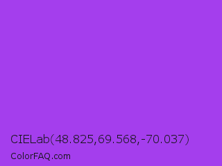 CIELab 48.825,69.568,-70.037 Color is a normal purple color and the nearest color is Navy Purple #9457eb. Hex code #a43eed and RGB value is rgb(164,62,237). In RGB color space, this color is composed of 64% red, 24% green, 93% blue, In CMYK color space, this color is composed of 31% cyan, 74% magenta, 0% yellow , 7% black , In HSL color space, this color has a hue angle of 275° , 83% saturation and 59% lightness.