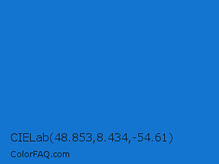 CIELab 48.853,8.434,-54.61 Color is a normal blue color and the nearest color is Bright Navy Blue #1974d2. Hex code #1475d1 and RGB value is rgb(20,117,209). In RGB color space, this color is composed of 8% red, 46% green, 82% blue, In CMYK color space, this color is composed of 90% cyan, 44% magenta, 0% yellow , 18% black , In HSL color space, this color has a hue angle of 209° , 83% saturation and 45% lightness.