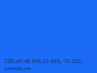 CIELab 48.856,29.865,-76.002 Color is a normal blue color and the nearest color is Blue Crayola #1f75fe. Hex code #1c6bf7 and RGB value is rgb(28,107,247). In RGB color space, this color is composed of 11% red, 42% green, 97% blue, In CMYK color space, this color is composed of 89% cyan, 57% magenta, 0% yellow , 3% black , In HSL color space, this color has a hue angle of 218° , 93% saturation and 54% lightness.