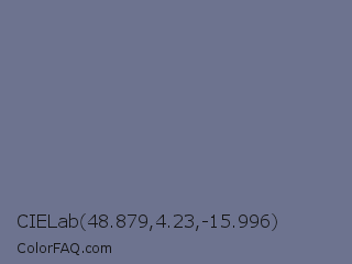 CIELab 48.879,4.23,-15.996 Color is a normal blue color and the nearest color is Storm Gray #717486. Hex code #6d738f and RGB value is rgb(109,115,143). In RGB color space, this color is composed of 43% red, 45% green, 56% blue, In CMYK color space, this color is composed of 24% cyan, 20% magenta, 0% yellow , 44% black , In HSL color space, this color has a hue angle of 229° , 13% saturation and 49% lightness.