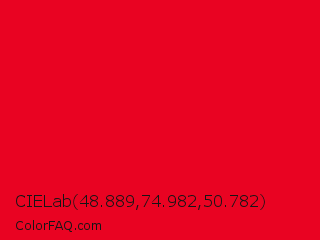 CIELab 48.889,74.982,50.782 Color is a normal red color and the nearest color is Spanish Red #e60026. Hex code #e90322 and RGB value is rgb(233,3,34). In RGB color space, this color is composed of 91% red, 1% green, 13% blue, In CMYK color space, this color is composed of 0% cyan, 99% magenta, 85% yellow , 9% black , In HSL color space, this color has a hue angle of 352° , 97% saturation and 46% lightness.