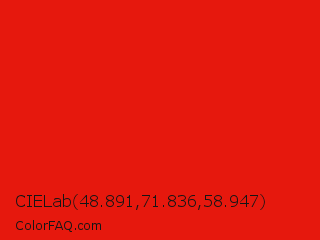 CIELab 48.891,71.836,58.947 Color is a normal red color and the nearest color is Lust #e62020. Hex code #e6180d and RGB value is rgb(230,24,13). In RGB color space, this color is composed of 90% red, 9% green, 5% blue, In CMYK color space, this color is composed of 0% cyan, 90% magenta, 94% yellow , 10% black , In HSL color space, this color has a hue angle of 3° , 89% saturation and 48% lightness.