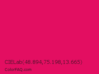 CIELab 48.894,75.198,13.665 Color is a normal rose color and the nearest color is Ruby #e0115f. Hex code #e30e61 and RGB value is rgb(227,14,97). In RGB color space, this color is composed of 89% red, 5% green, 38% blue, In CMYK color space, this color is composed of 0% cyan, 94% magenta, 57% yellow , 11% black , In HSL color space, this color has a hue angle of 337° , 88% saturation and 47% lightness.