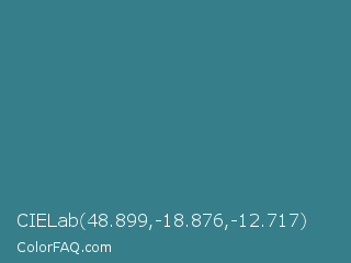 CIELab 48.899,-18.876,-12.717 Color is a normal cyan color and the nearest color is Paradiso #317d82. Hex code #367e89 and RGB value is rgb(54,126,137). In RGB color space, this color is composed of 21% red, 49% green, 54% blue, In CMYK color space, this color is composed of 61% cyan, 8% magenta, 0% yellow , 46% black , In HSL color space, this color has a hue angle of 188° , 43% saturation and 37% lightness.