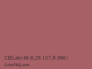CIELab 48.8,29.107,8.986 Color is a normal red color and the nearest color is Deep Puce #a95c68. Hex code #a66066 and RGB value is rgb(166,96,102). In RGB color space, this color is composed of 65% red, 38% green, 40% blue, In CMYK color space, this color is composed of 0% cyan, 42% magenta, 39% yellow , 35% black , In HSL color space, this color has a hue angle of 355° , 28% saturation and 51% lightness.