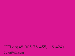 CIELab 48.905,76.455,-16.424 Color is a normal magenta color and the nearest color is Barbie Pink #e0218a. Hex code #da1592 and RGB value is rgb(218,21,146). In RGB color space, this color is composed of 85% red, 8% green, 57% blue, In CMYK color space, this color is composed of 0% cyan, 90% magenta, 33% yellow , 15% black , In HSL color space, this color has a hue angle of 322° , 82% saturation and 47% lightness.