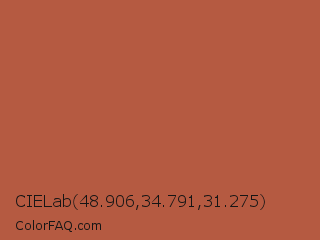 CIELab 48.906,34.791,31.275 Color is a normal red color and the nearest color is Brown Rust #af593e. Hex code #b55a41 and RGB value is rgb(181,90,65). In RGB color space, this color is composed of 71% red, 35% green, 25% blue, In CMYK color space, this color is composed of 0% cyan, 50% magenta, 64% yellow , 29% black , In HSL color space, this color has a hue angle of 13° , 47% saturation and 48% lightness.