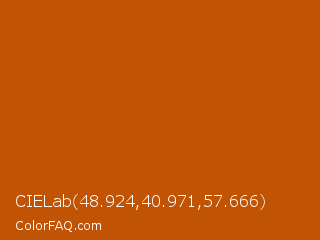 CIELab 48.924,40.971,57.666 Color is a normal orange color and the nearest color is Rose Of Sharon #bf5500. Hex code #c15304 and RGB value is rgb(193,83,4). In RGB color space, this color is composed of 76% red, 33% green, 2% blue, In CMYK color space, this color is composed of 0% cyan, 57% magenta, 98% yellow , 24% black , In HSL color space, this color has a hue angle of 25° , 96% saturation and 39% lightness.