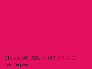 CIELab 48.928,75.099,13.712 Color is a normal rose color and the nearest color is Ruby #e0115f. Hex code #e30f61 and RGB value is rgb(227,15,97). In RGB color space, this color is composed of 89% red, 6% green, 38% blue, In CMYK color space, this color is composed of 0% cyan, 93% magenta, 57% yellow , 11% black , In HSL color space, this color has a hue angle of 337° , 88% saturation and 47% lightness.