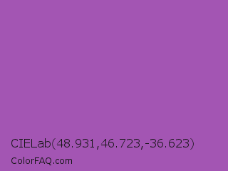 CIELab 48.931,46.723,-36.623 Color is a normal purple color and the nearest color is Purple Plum #9c51b6. Hex code #a355b3 and RGB value is rgb(163,85,179). In RGB color space, this color is composed of 64% red, 33% green, 70% blue, In CMYK color space, this color is composed of 9% cyan, 53% magenta, 0% yellow , 30% black , In HSL color space, this color has a hue angle of 290° , 38% saturation and 52% lightness.