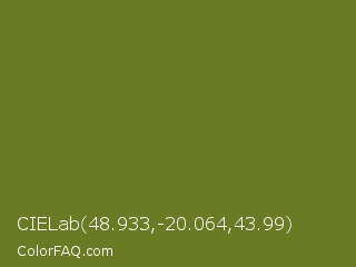 CIELab 48.933,-20.064,43.99 Color is a normal lime color and the nearest color is Fern Frond #657220. Hex code #697c23 and RGB value is rgb(105,124,35). In RGB color space, this color is composed of 41% red, 49% green, 14% blue, In CMYK color space, this color is composed of 15% cyan, 0% magenta, 72% yellow , 51% black , In HSL color space, this color has a hue angle of 73° , 56% saturation and 31% lightness.