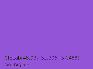 CIELab 48.937,51.396,-57.488 Color is a normal violet color and the nearest color is Navy Purple #9457eb. Hex code #9454d7 and RGB value is rgb(148,84,215). In RGB color space, this color is composed of 58% red, 33% green, 84% blue, In CMYK color space, this color is composed of 31% cyan, 61% magenta, 0% yellow , 16% black , In HSL color space, this color has a hue angle of 269° , 62% saturation and 59% lightness.