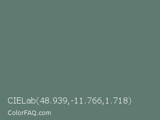 CIELab 48.939,-11.766,1.718 Color is a normal green color and the nearest color is Nevada #646e75. Hex code #5f7a71 and RGB value is rgb(95,122,113). In RGB color space, this color is composed of 37% red, 48% green, 44% blue, In CMYK color space, this color is composed of 22% cyan, 0% magenta, 7% yellow , 52% black , In HSL color space, this color has a hue angle of 160° , 12% saturation and 43% lightness.