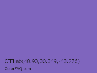 CIELab 48.93,30.349,-43.276 Color is a normal indigo color and the nearest color is Blue Marguerite #7666c6. Hex code #7f65be and RGB value is rgb(127,101,190). In RGB color space, this color is composed of 50% red, 40% green, 75% blue, In CMYK color space, this color is composed of 33% cyan, 47% magenta, 0% yellow , 25% black , In HSL color space, this color has a hue angle of 258° , 41% saturation and 57% lightness.