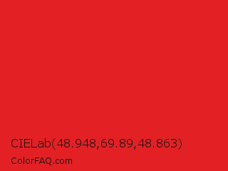 CIELab 48.948,69.89,48.863 Color is a normal red color and the nearest color is Lust #e62020. Hex code #e32125 and RGB value is rgb(227,33,37). In RGB color space, this color is composed of 89% red, 13% green, 15% blue, In CMYK color space, this color is composed of 0% cyan, 85% magenta, 84% yellow , 11% black , In HSL color space, this color has a hue angle of 359° , 78% saturation and 51% lightness.